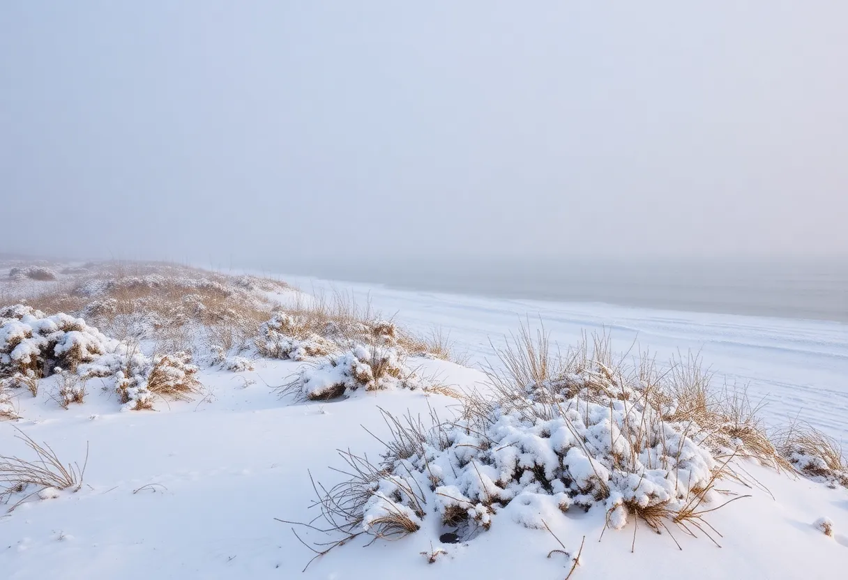 A snowy beach scene in Myrtle Beach during winter storm